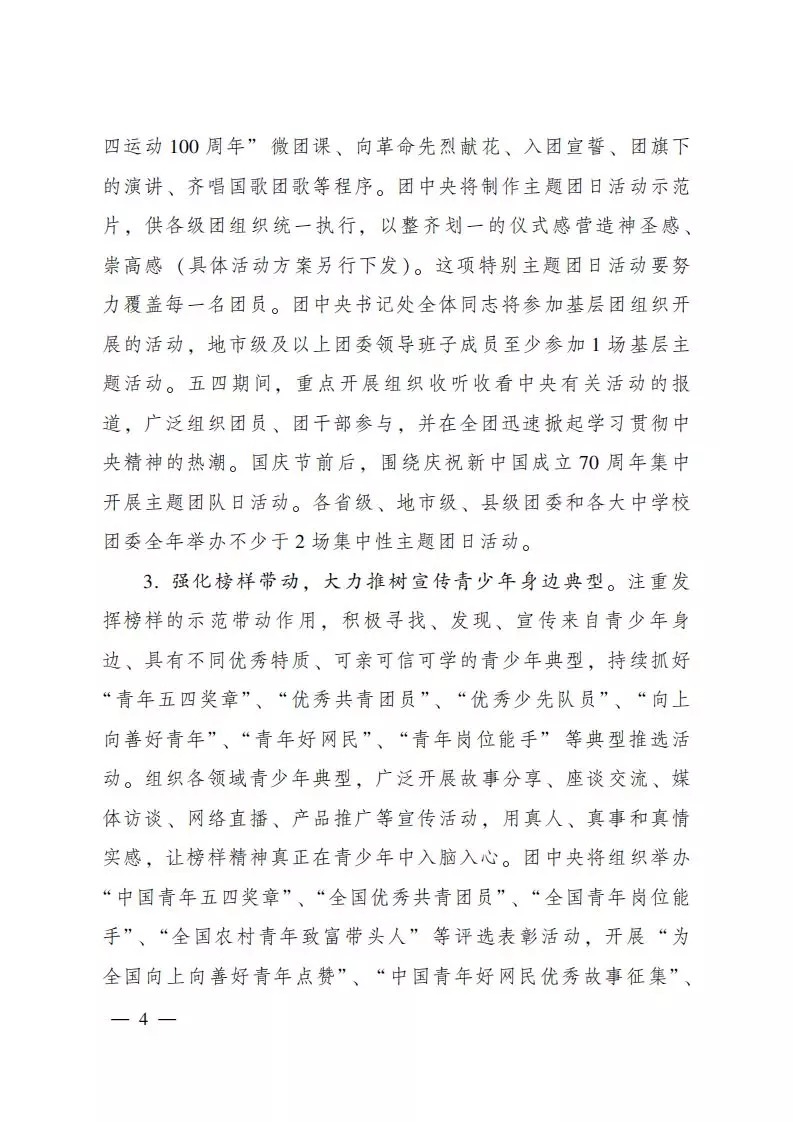 要大力推树宣传青少年身边典型,持续抓好“青年五四奖章”“优秀少先队员”“向上向善好青年”等典型推选活动。要普遍开展青少年主题网络活动,广泛开展“五四青年节”“五四100周年”等网络话题活动,结合线下主题团日活动,集中举办网络直播活动。要大力实施青少年文化精品工程,积极策划生产和推介一批阐释党的理论主张、具有鲜明价值导向、符合青少年思想特点的“青年版”“儿童版”文化产品。要开展青春建功新时代实践活动,紧密结合团的重点工作品牌,组织动员广大青年在深化改革开放、决胜全面小康进程中贡献青春力量。要大力开展全媒体主题宣传活动,充分报道各级团组织开展主题宣传教育实践活动的成效,集中展示各地团组织和广大青少年的良好精神风貌。