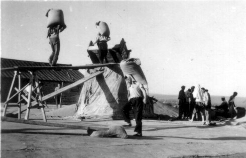 有一次,我站在联合收割机后面的草车上整理草堆。老式机械的草车是分离式的,单轴两轮,用牵引杠挂在主机尾部。在一个山丘顶部掉头转弯时,牵引杠的销子突然脱落,草车因脱离了主机的约束而迅速顺陡坡滑动,差一点儿向前翻倒。我紧紧抓住草车的护栏,差一点儿被甩出草车……