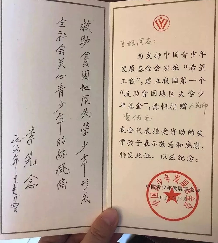 1989年,希望工程正式设立,王娅立刻捐出100元,当时她的工资还不足200元,捐出的是她月工资的一大部分。