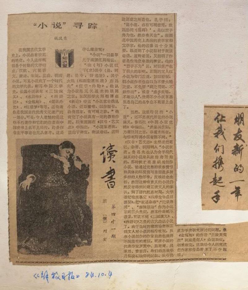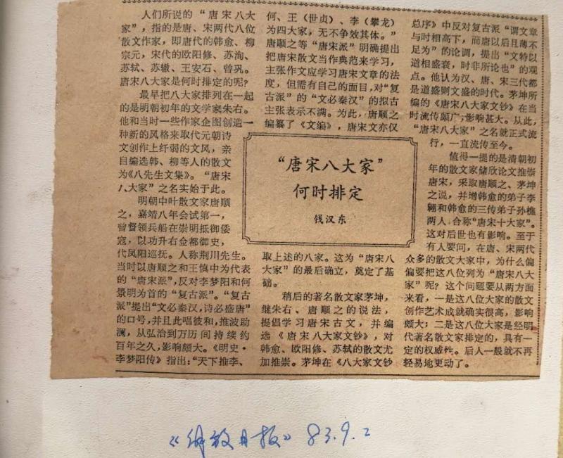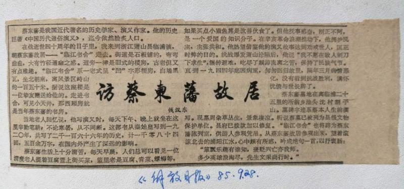 钱汉东上世纪80年代发表在《解放日报》上的文章剪报,其中《访蔡东藩故居》一文标题为钱汉东书法。