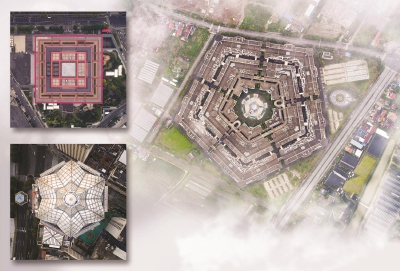 五角世贸商城位于浦东新区惠南镇,地面5层,空中俯瞰是一个规则的五角形。左上图:中华艺术宫位于浦东世博园区,由2010年上海世博会中国国家馆改建而成,展示面积7万平方米,大红外观,斗拱造型,空中俯瞰像一个斗。左图:光明大厦是外滩沿江唯一一栋超高层商务楼,楼高32层,空中俯瞰像一把撑开的雨伞。制图/邢千里