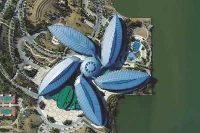 上海滴水湖皇冠假日酒店位于浦东新区临港新城,空中俯瞰就像一棵五叶草。