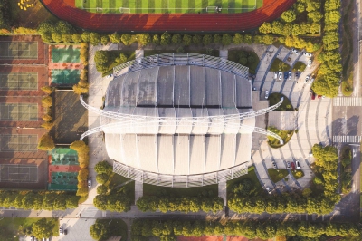 上海工程技术大学体育馆位于松江大学城,靠近广富林遗址公园,空中俯瞰像一只趴着的甲壳虫。