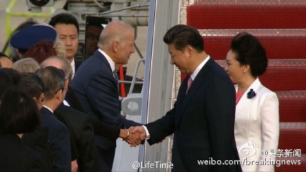 习近平乘坐的专机24号下午5点15分左右抵达了华盛顿安德鲁斯空军基地,习近平与夫人彭丽媛步出舱门。美国副总统拜登携夫人到场迎接。美方代表还包括美国助理国务卿拉塞尔。
