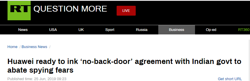 RT说,印度《经济时报》援引华为印度分公司首席执行官陈杰的话称,“我们正在向印度政府提议,我们准备签署一项‘无后门’协议。我们鼓励其他原始设备制造商也与(印度)政府和电信运营商签署此类协议”。