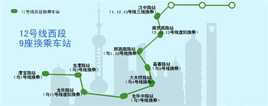12号线西段全长21公里,穿越闵行、徐汇、黄浦、静安及闸北5区,共设16座车站,全为地下车站,其中换乘站9座,分别为:漕宝路站(与1号线换乘)、龙漕路站(与3号线换乘)、龙华路站(与11号线虚拟换乘)、龙华中路站(与7号线换乘)、大木桥路站(与4号线换乘)、嘉善路站(与9号线换乘)、陕西南路站(与1号线、10号线换乘)、南京西路站(与2号线、13号线虚拟换乘)、汉中路站(与1号线、13号线换乘)。