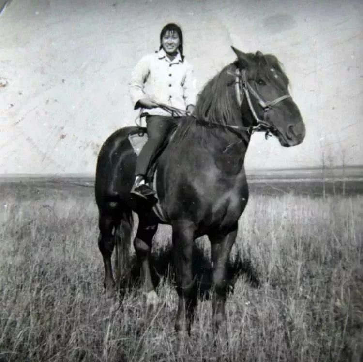 上面这张图片,就是文中提到的当年谭明饲养的大种马。深灰色,身上一根杂毛也没有。马背上是上海知青姚志云当年留影。