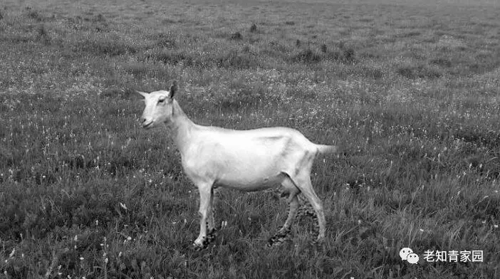 正没辙时,看到身边有一只母山羊,岁数不小了,全身基本雪白,只胡子梢儿与蹄子尖儿呈灰色,正起劲儿啃我附近的草棵子,嘴飞快蠕动,身边有只和它几乎一个模子刻出来的小山羊,围着它咩咩乱叫,跟娘撒娇呢!灵机一动,我想到了用羊奶解渴。