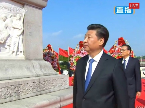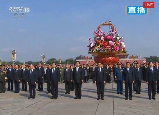 十八大后的第一个国庆,习近平、李克强、张德江、俞正声、刘云山、王岐山、张高丽等党和国家领导人于2013年10月1日10点前,冒着细雨步行来到天安门广场中央,出席向人民英雄纪念碑敬献花篮仪式。