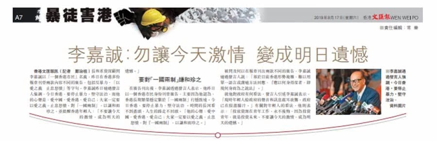 8月16日,李嘉诚针对当前的香港局势首度发声,包下多家香港报纸头版刊登大幅广告,以“一个香港市民”的身份呼吁停止暴力,爱国爱港。