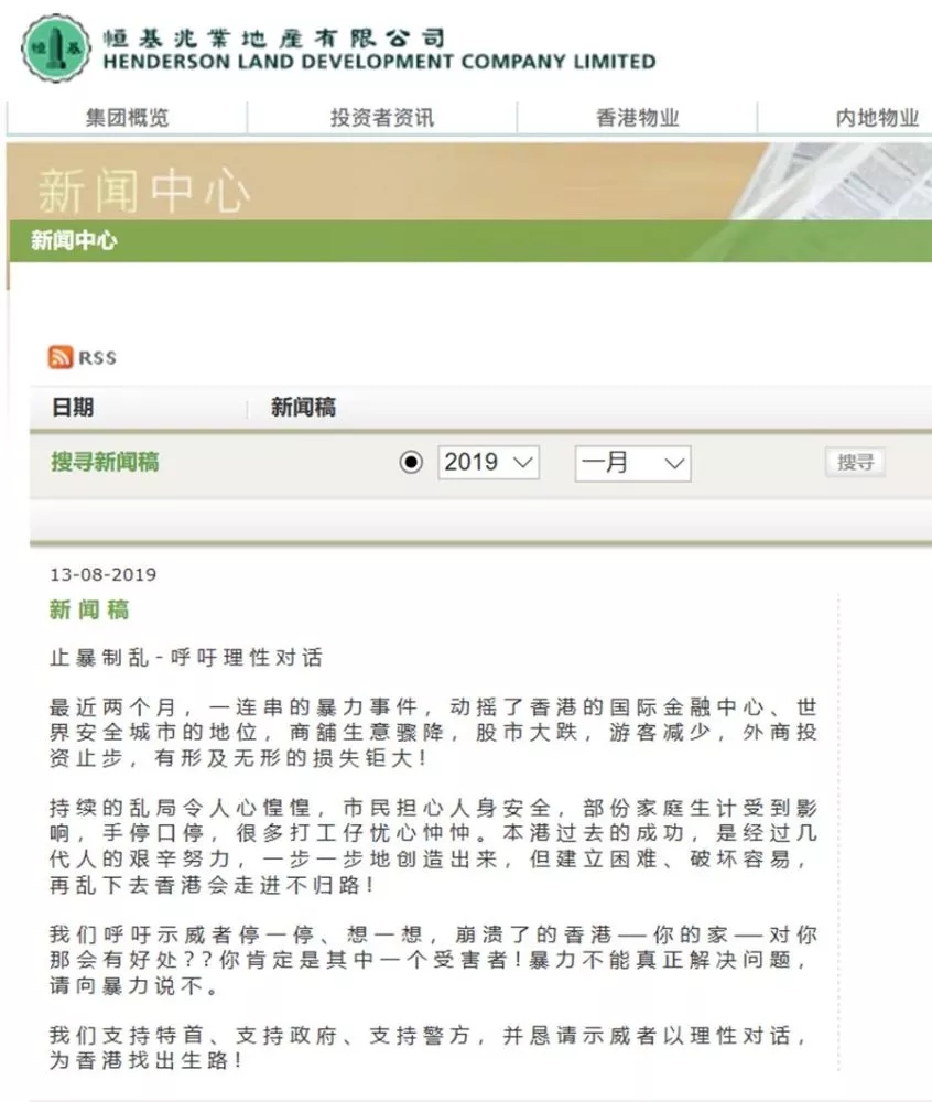 8月13日,恒基地产官网发布《止暴制乱 呼吁理性对话》的声明称,最近两个月,一连串的暴力事件,动摇了香港的国际金融中心、世界安全城市的地位,商铺生意骤降,股市大跌,游客减少,外商投资止步,有形及无形的损失巨大!