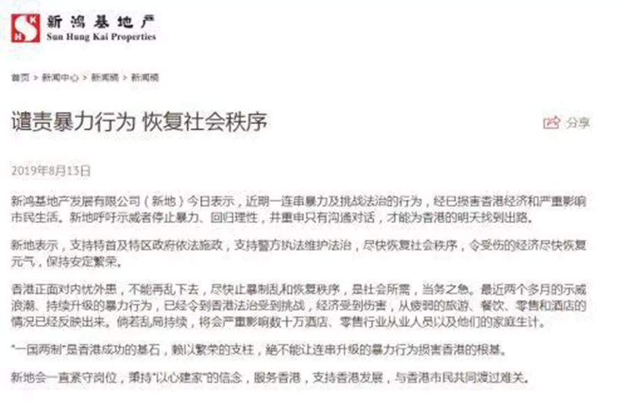 8月13日,新鸿基地产发表声明,指近期一连串暴力及挑战法治的行为,已经损害香港经济和严重影响市民生活,呼吁示威者停止暴力回归理性,并重申只有沟通对话,才能为香港的明天找到出路。
