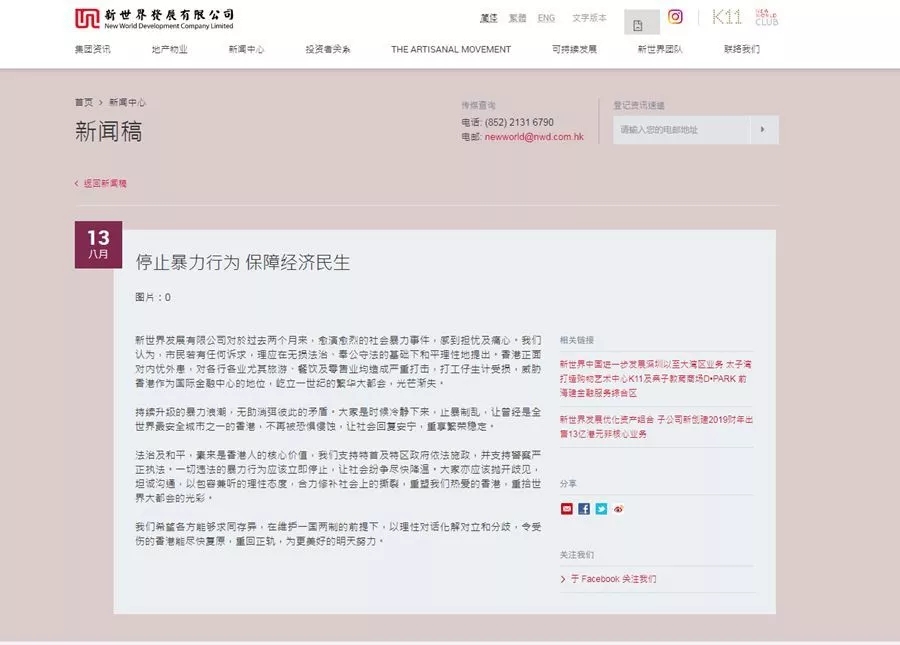 8月13日,新世界发展在官网上,发布《停止暴力行为 保障经济民生》声明称,新世界发展有限公司对于过去两个月来,愈演愈烈的社会暴力事件,感到担忧及痛心。我们认为,市民若有任何诉求,理应在无损法治、奉公守法的基础下和平理性地提出。香港正面对内忧外患,对各行各业尤其旅游、餐饮及零售业均造成严重打击,打工仔生计受损,威胁香港作为国际金融中心的地位,屹立一世纪的繁华大都会,光芒渐失。