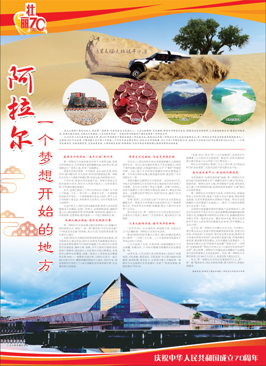 从1949年三五九旅开启筑城之梦,到1957年新疆生产建设兵团农一师屯垦戍边,再到2004年第一师阿拉尔市人民政府挂牌成立,第一师阿拉尔市成为共和国年轻的城市之一,总面积6937平方公里,下辖四镇十五个团三个街道一个乡和多家企事业单位,经过60多年的发展,总人口由1万增长到38万,地区生产总值由2350万元增长到308.55亿元。一个经济充满活力、水城风貌彰显、生活品质良好、人居环境优美的“丝路新城”正在不断延伸着丝绸之路经济带的壮丽画卷。