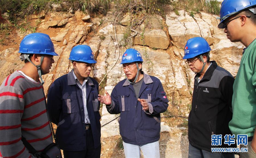 南仁东(左三)与工程技术人员在位于黔南州平塘县的大窝凼施工现场检查施工进展(2014年12月1日摄)。新华社发(中科院国家天文台供图)