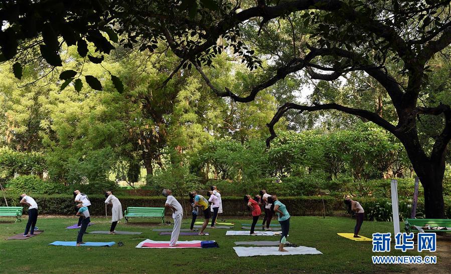 这是在印度新德里,人们在公园练习瑜伽(2019年6月21日摄)。 新华社记者 张迺杰 摄
