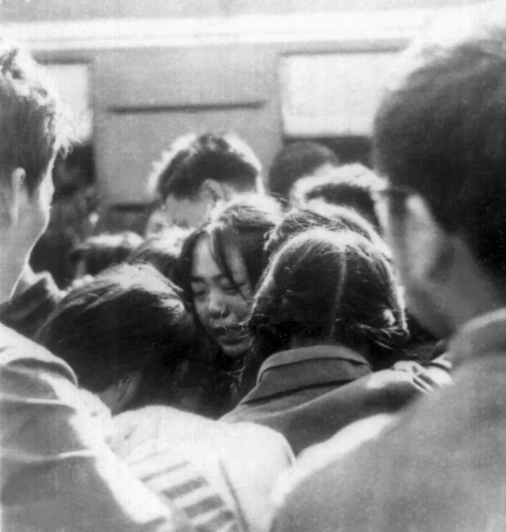 该介绍一下这张照片了。这是1969年,上海崂山中学(现东昌中学东校)67届初中女学生唐为琴到黑龙江下乡出发时在火车站难抑离别之情,与亲人抱头痛哭的情景。