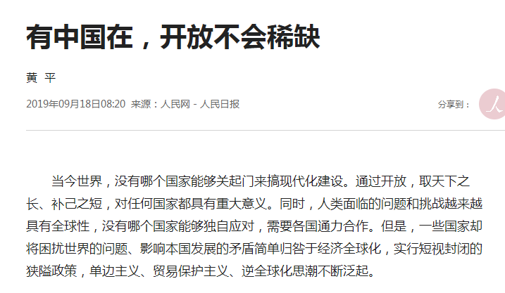 “当今世界,没有哪个国家能够关起门来搞现代化建设。”今年9月18日,《人民日报》曾发表《有中国在,开放不会稀缺》的文章。