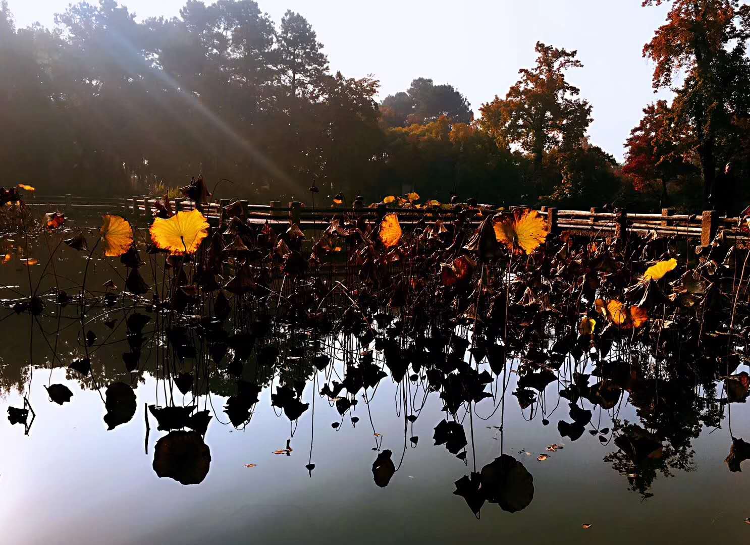 步入园内,十景塘映入眼帘。放眼望去,右边的古枫树树叶在阳光下红光闪闪,塘里巳经枯了的荷叶也不甘平庸,在平静的水面下,着上几片淡淡的墨色。给池塘平添了一份水墨画的韵味。