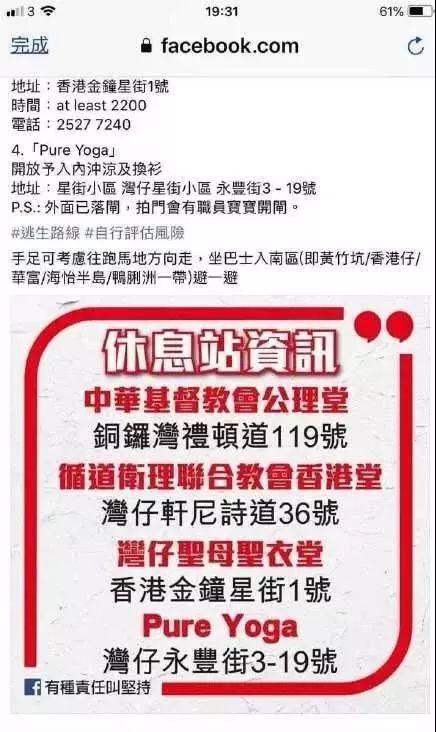 这家位于香港湾仔轩尼诗道36号的教会堂所,可谓“大名鼎鼎”,早在非法“占中”期间,就因庇护暴徒和存储示威物资被称为“占中粮仓”。由于常处于游行路线上,无论是非法“占中”、旺角“暴乱”还是本次“修例风波”,该教堂都不遗余力,多次开放大门为示威者提供庇护,以及存储大批示威物资。五个月来,香港堂的Facebook账号,更是多次发布为暴徒提供休息场所等相关服务的内容。