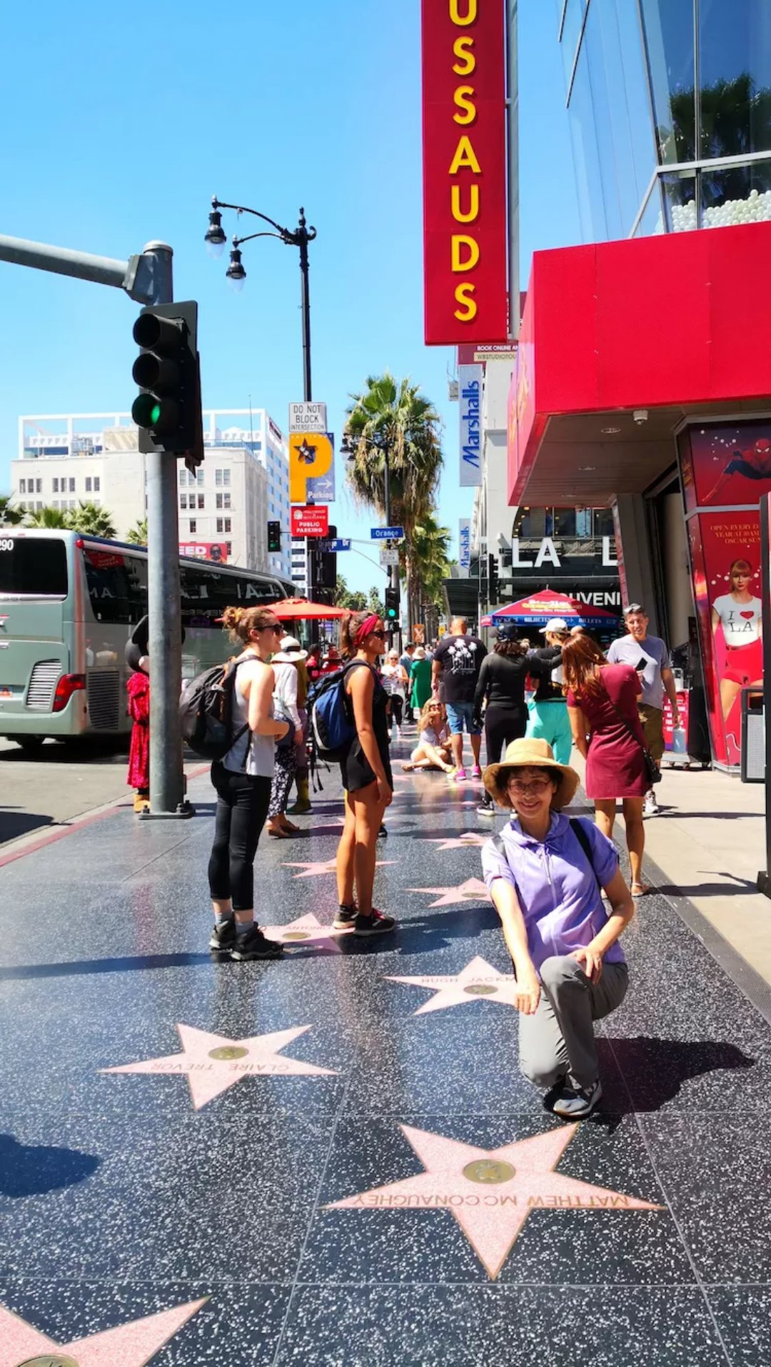 好莱坞星光大道,原来仅是一条人人可来的热闹商业大街,什么人都有,唐老鸭、钢铁侠、蜘蛛人、半露美女、举着广告牌的大叔、揽你拍照的摄影人、半卧墙脚的流浪者……。当然,更多是匆匆走过的行人和我们这样的旅游者。