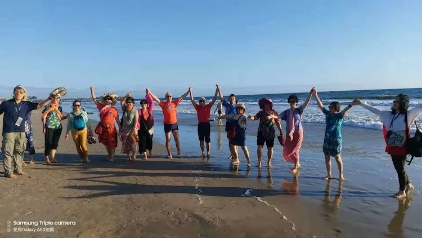 落日的美就美在心中、美在遂人愿,女同胞们纷纷纤指造型许上美好的心愿。