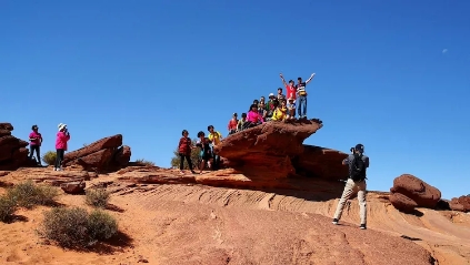 这是亿万年前海底盐层地质抬升見天,经风雨吹涮形成了如此奇观,大家纷纷登上拱门,眺望大拱门外原野的壮阔,留下了欢笑雀跃的合影。