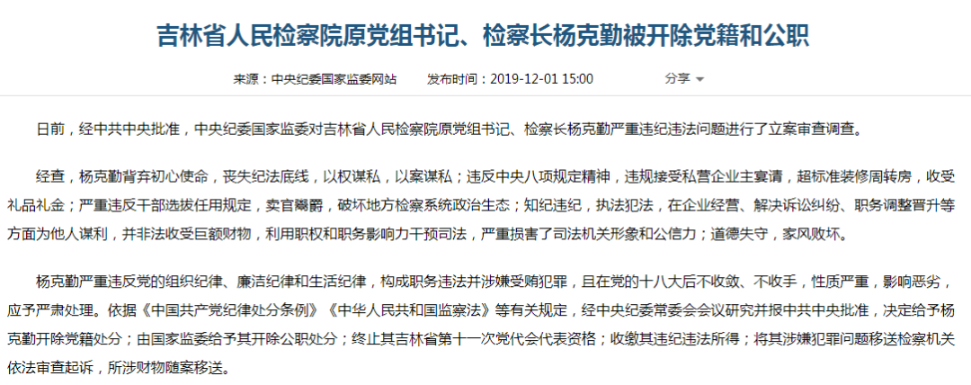 在他落马前,吉林省已有多名私企老板因涉杨克勤案,被有关部门带走配合调查。