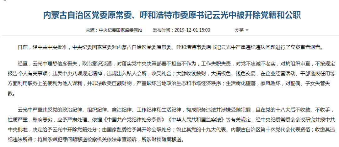 其中,履新前曾被煤老板前往机场恭迎的云光中,被指“严重破坏当地政治生态和市场经济秩序”。