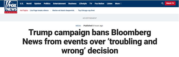 声明最后还提到:“我们将视情况决定,是否会与个别记者接触或回答彭博社记者的提问。除非彭博社改变决定,否则特朗普竞选团队的这项政策将保持不变。”
