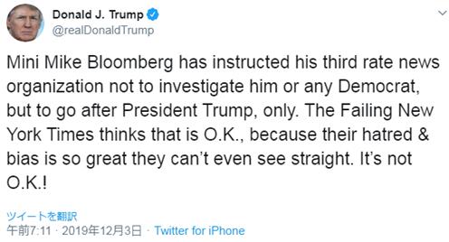 12月3日,特朗普也发布推文怒斥布隆伯格及其媒体团队。他称:“小迈克·布隆伯格指示他的三流媒体不调查其它任何民主党人,就知道追着特朗普总统不放。失败的纽约时报还觉得这样做OK,因为他们的仇恨与偏见是如此之大,以至于他们看不清真相。这一点也不OK!”