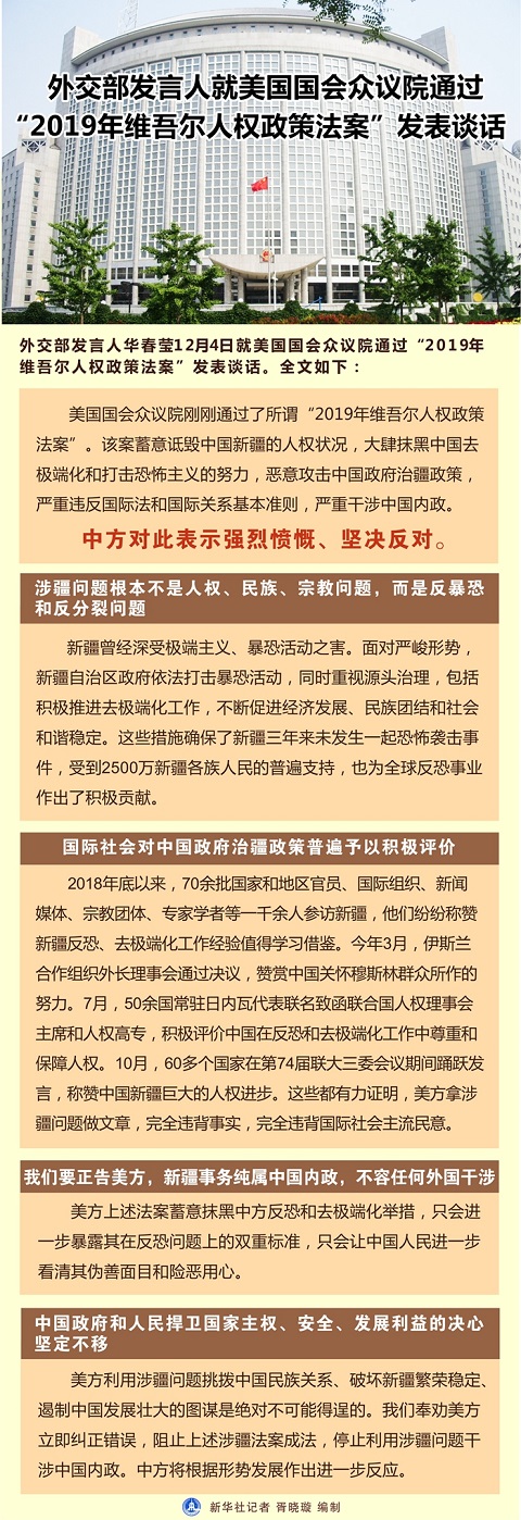 新华社北京12月4日电 外交部发言人华春莹4日就美国国会众议院通过“2019年维吾尔人权政策法案”发表谈话。全文如下: