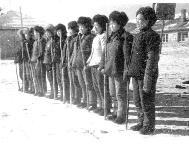 在农业连队有人调侃:全连一支枪,——那是连长的;全排一支枪,——那是值班用的;一人一支枪,——那是木头的。说笑归说笑,事实还真是如此。这张照片就是最好的佐证:照片拍摄于 1972年早春,冰雪尚未消融,黑龙江省嫩江县星火五七农场的一队女知青在上海下放干部、老红军、原上海橡胶公司党委书记李英同志(右一)带领下,克服缺乏枪支的困难,手持木棍进行队列训练。上海下放干部董景星用他带到黑龙江的相机记录下了这一颇具历史感的画面。