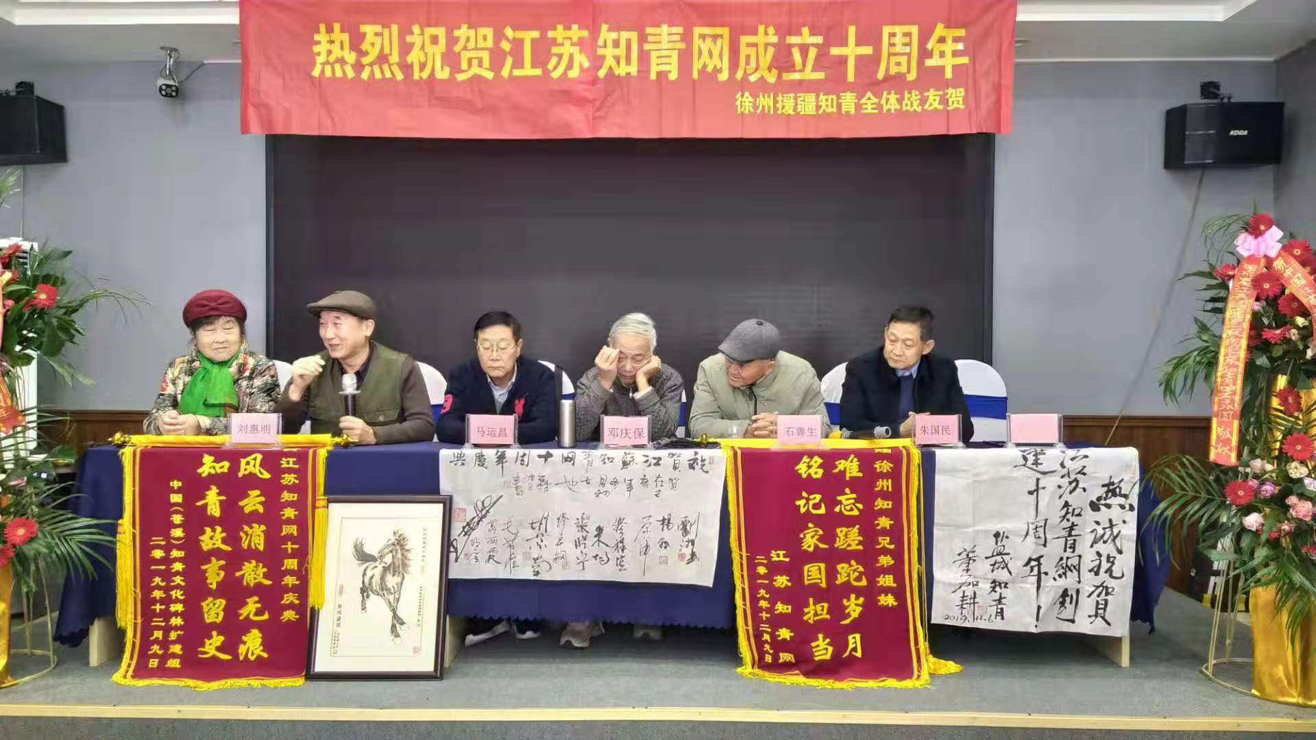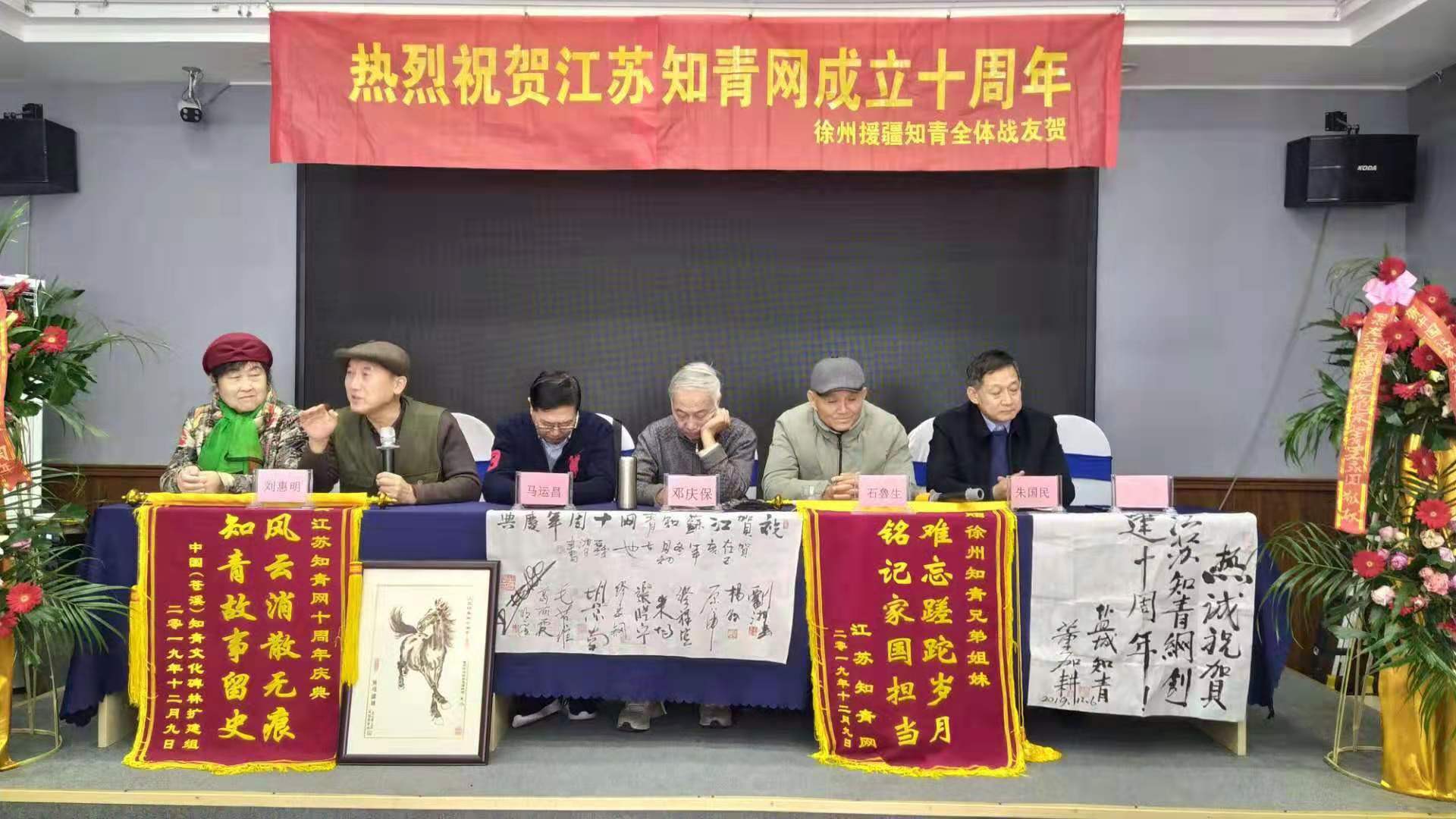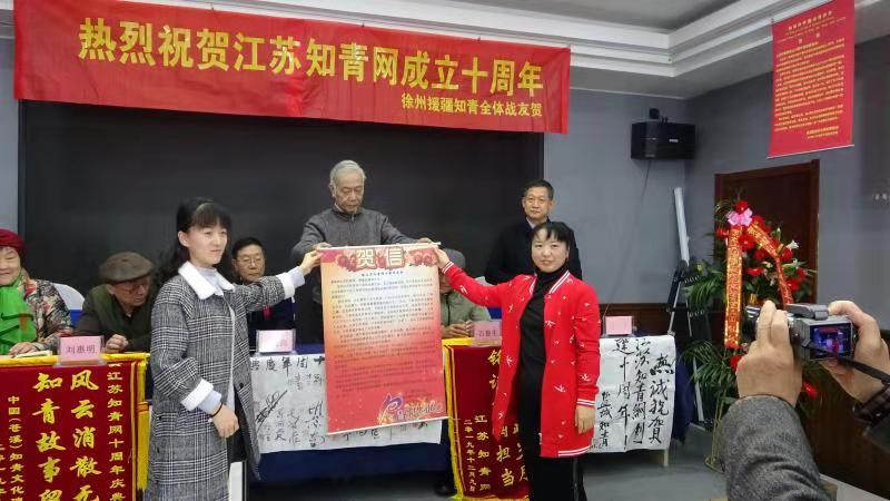 继2017年在省会南京、2018年在苏南无锡分别举办江苏知青网年会后,今年12月8至9日又在苏北徐州市米兰花酒店三楼百花厅,隆重而简朴地举办了江苏知青网十周年庆典活动。满堂庆贺的横幅、花篮、锦旗、墨宝和贺信展图等,洋溢着一派喜气洋洋欢欣鼓舞的气氛。尽管天寒岁暮,仍然迎来了北京、上海、山东和黑龙江省的嘉宾。闻名中外的全国知青标兵董加耕老大哥亲笔题写送来墨宝“热诚庆贺江苏知青网创建十周年!”海内外知青界纷至沓来许许多多热情洋溢的贺信,还以贺联贺诗等许多其他方式表达了对江苏知青网十周年庆典的由衷祝贺。来自全省各地的知青包括徐州援疆知青艺术团演员六十余人参与。
