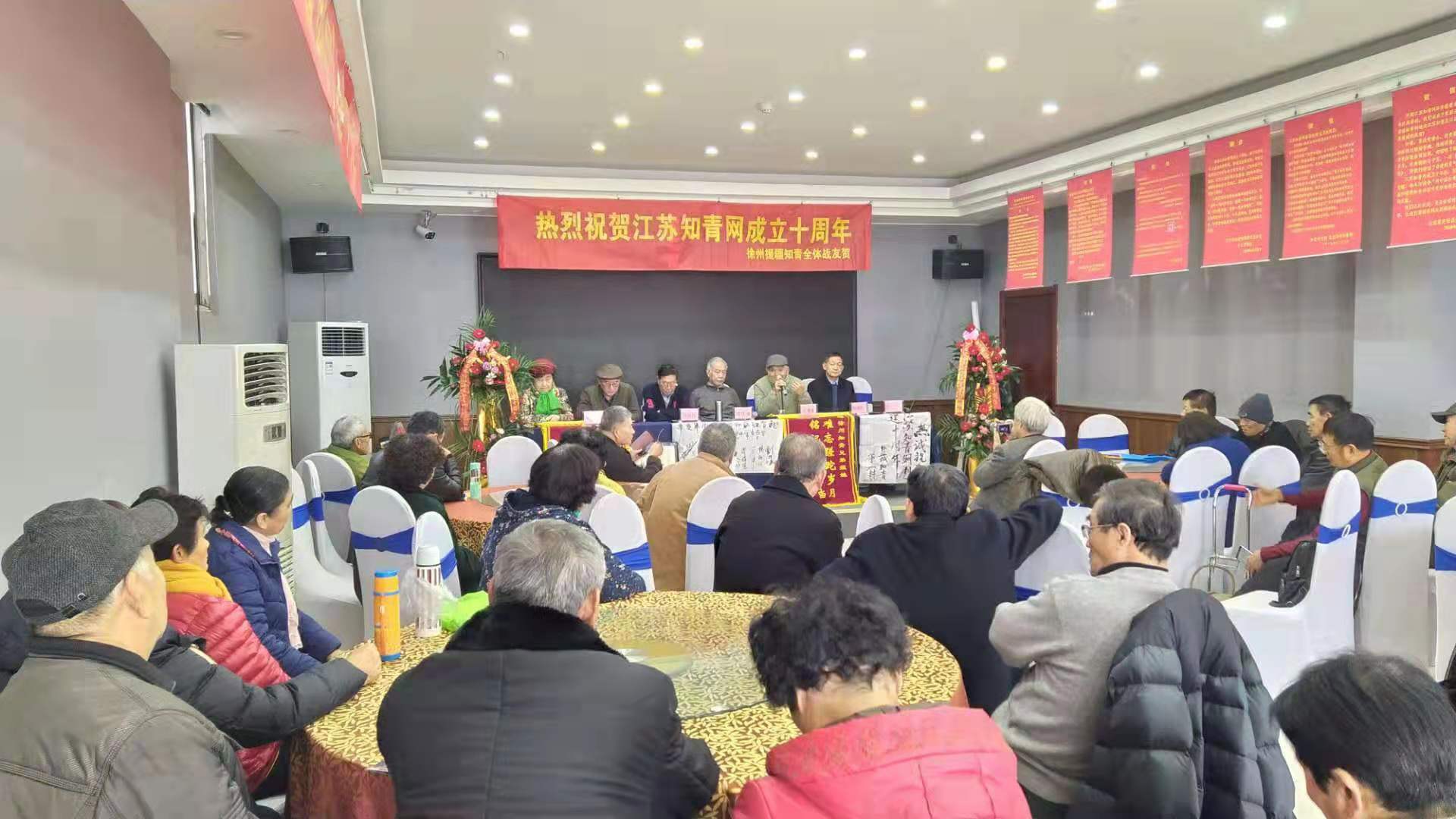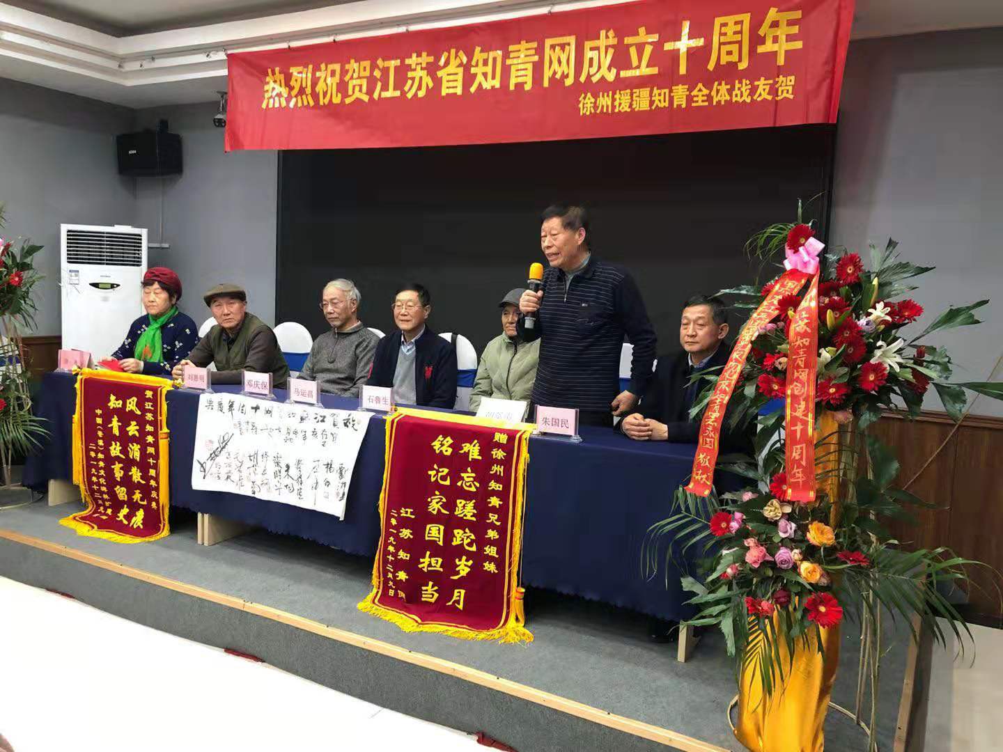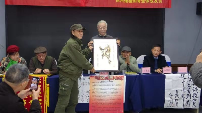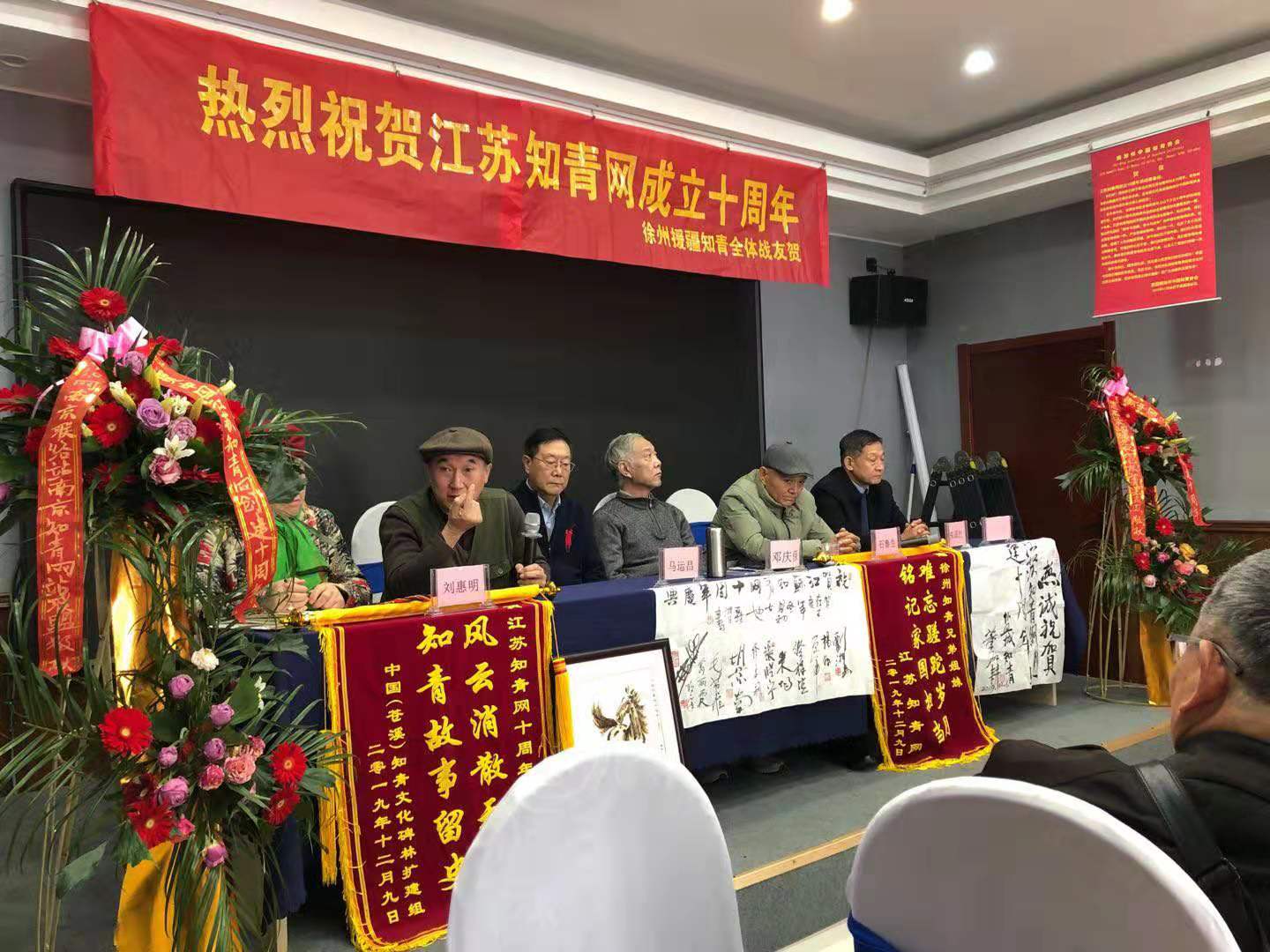 继2017年在省会南京、2018年在苏南无锡分别举办江苏知青网年会后,今年12月8至9日又在苏北徐州市米兰花酒店三楼百花厅,隆重而简朴地举办了江苏知青网十周年庆典活动。满堂庆贺的横幅、花篮、锦旗、墨宝和贺信展图等,洋溢着一派喜气洋洋欢欣鼓舞的气氛。尽管天寒岁暮,仍然迎来了北京、上海、山东和黑龙江省的嘉宾。闻名中外的全国知青标兵董加耕老大哥亲笔题写送来墨宝“热诚庆贺江苏知青网创建十周年!”海内外知青界纷至沓来许许多多热情洋溢的贺信,还以贺联贺诗等许多其他方式表达了对江苏知青网十周年庆典的由衷祝贺。来自全省各地的知青包括徐州援疆知青艺术团演员六十余人参与。