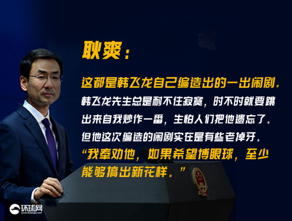 耿爽表示,我看到了英国媒体的有关报道。这都是韩飞龙自己编造出的一出闹剧。韩飞龙先生总是耐不住寂寞,时不时就要跳出来自我炒作一番,生怕人们把他遗忘了。但他这次编造的闹剧实在是有些老掉牙。“我奉劝他,如果希望博眼球,至少能够搞出新花样。”