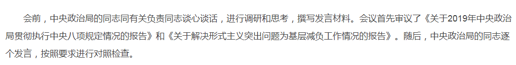 会前,中央政治局的同志同有关负责同志谈心谈话,进行调研和思考,撰写发言材料。会议首先审议了《关于2019年中央政治局贯彻执行中央八项规定情况的报告》和《关于解决形式主义突出问题为基层减负工作情况的报告》。随后,中央政治局的同志逐个发言,按照要求进行对照检查。