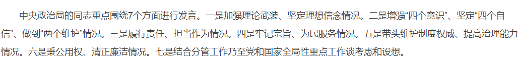 中央政治局的同志重点围绕7个方面进行发言。一是加强理论武装、坚定理想信念情况。二是增强“四个意识”、坚定“四个自信”、做到“两个维护”情况。三是履行责任、担当作为情况。四是牢记宗旨、为民服务情况。五是带头维护制度权威、提高治理能力情况。六是秉公用权、清正廉洁情况。七是结合分管工作乃至党和国家全局性重点工作谈考虑和设想。