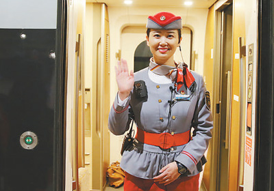 青岛北高铁站,列车员在出发前向人们挥手致意。 张进刚摄(人民视觉)