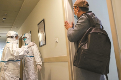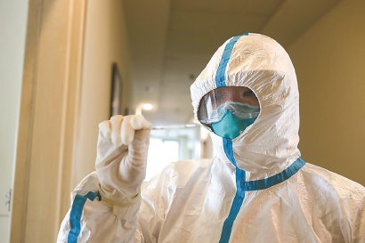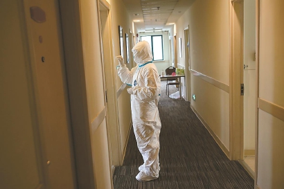 当任何一间客房内的隔离者出现身体情况异常时,医护人员就要穿上一级防护的全套隔离服装,穿越从清洁区到污染区的通道,进入潜在的风险空间。这条穿越之路,充满不确定性和危险。但他们,依然一次次走着……