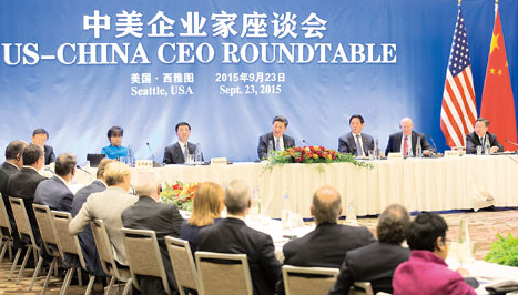图为:2015年9月23日,国家主席习近平在西雅图出席中美企业家座谈会。