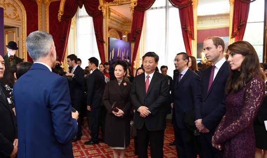 图为:2015年10月21日,国家主席习近平和夫人彭丽媛在英国威廉王子夫妇陪同下,出席在伦敦举行的中英创意产业展。