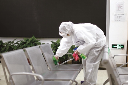 朱良身穿防护服,忙着做好消毒工作 受访者供图