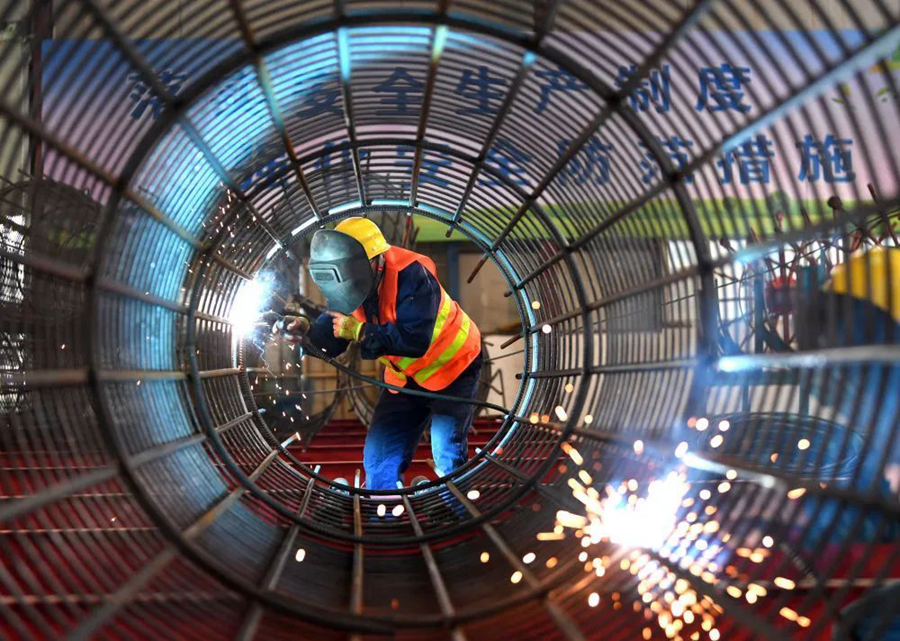 中铁四局工人在滁宁城际铁路二期工程二标项目钢筋加工车间施工(2月15日摄)。新华社发(韩新亮 摄)