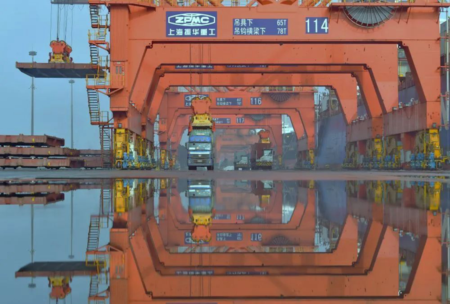 在唐山港京唐港区集装箱码头,工人操作机械设备吊装集装箱(2月21日摄)。新华社记者 杨世尧 摄