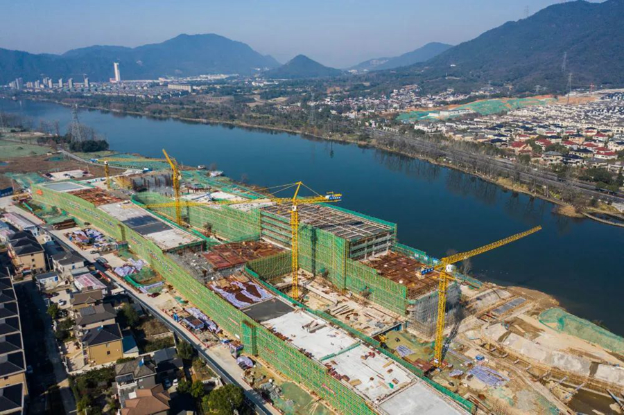 位于杭州市富阳区东洲街道的北支江亚运场馆项目现场(2月20日摄,无人机照片)。2月20日,位于浙江省杭州市富阳区东洲街道的省重点工程——北支江亚运场馆项目全面复工。新华社记者 徐昱 摄