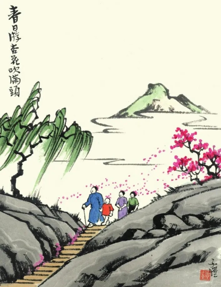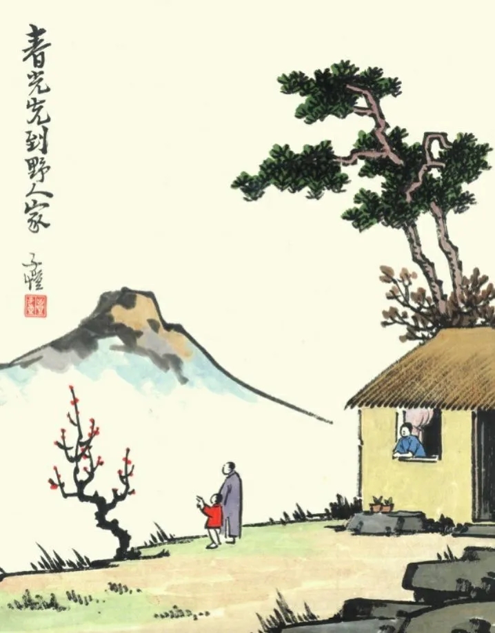 丰子恺曾画过一幅画:远方一座山,近处一道坡,坡上一草房,房前一树花。女儿一手拉着父亲,一手指着红花,母亲则趴在窗口,笑看观花的父女。 他还给这幅画题了句很妙的诗,“春光先到野人家”。