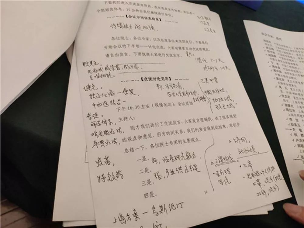 院士们的“小抄” 86岁的闻玉梅、75岁的陈凯先、72岁的赵国屏、70岁的饶子和四位院士正好坐在研讨会桌子的中间位置。在发表完主旨报告后,饶子和院士就打开电脑记录大家的发言,其他院士们则在本子上记了详细的几页纸。