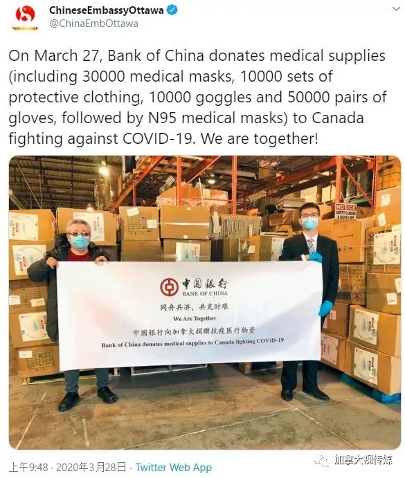 3月28日,中国驻加拿大大使馆在官方推特上发布消息称,中国银行已向加拿大捐赠医疗用品,以帮助该国抗击COVID-19大流行病。