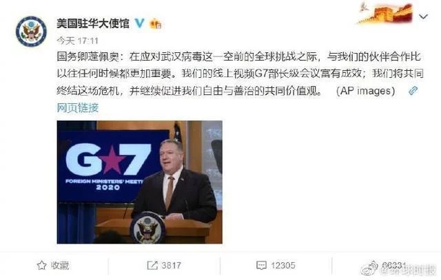 3月26日下午,美国驻华大使馆 官方微博连续在两篇文章中将新冠肺炎病毒称为“武汉病毒”,而在25日,美国国务卿蓬佩奥在七国集团外长举行视频会议后的记者会上,也将新冠肺炎病毒称为“武汉病毒”。